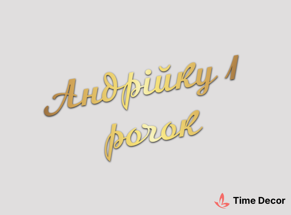 Пластиковий напис "Андрійку 1 рочок" – дзеркальний або матовий пластик, можливе виготовлення з клейкою зворотною поверхнею для легкого монтажу.