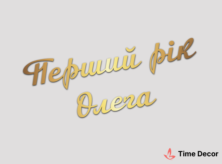 Пластиковий напис "Перший рік Олега" – дзеркальний або матовий пластик, можливе виготовлення з клейкою зворотною поверхнею для легкого монтажу.