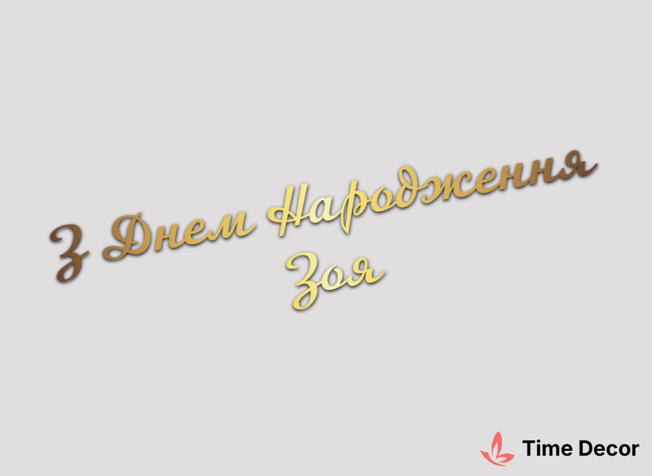 Пластиковий напис "З Днем Народження Зоя" – дзеркальний або матовий пластик, можливе виготовлення з клейкою зворотною поверхнею для легкого монтажу.