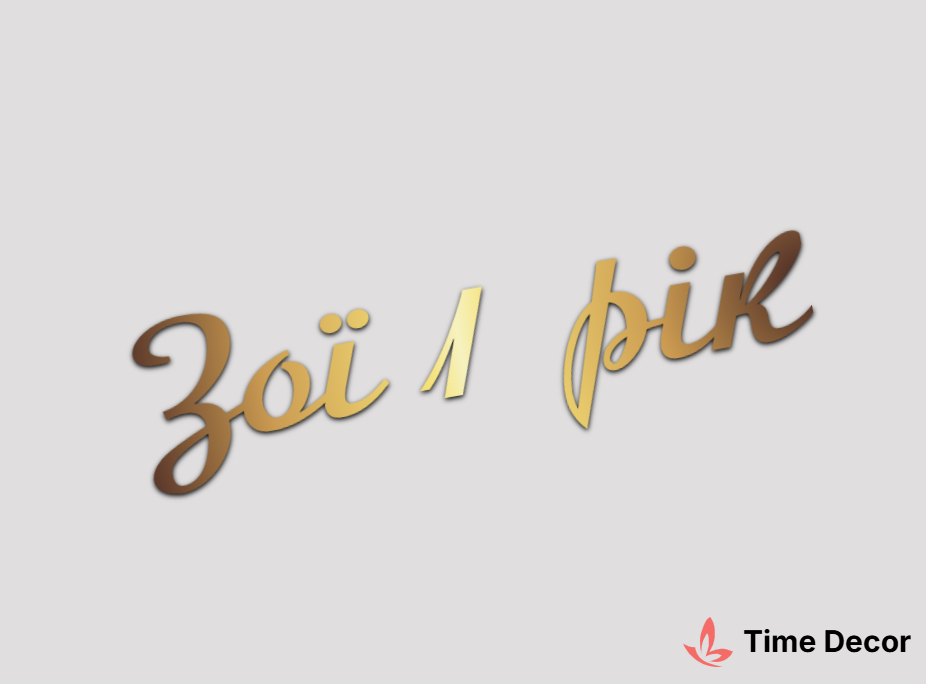 Пластиковий напис "Зої 1 рік" – дзеркальний або матовий пластик, можливе виготовлення з клейкою зворотною поверхнею для легкого монтажу.
