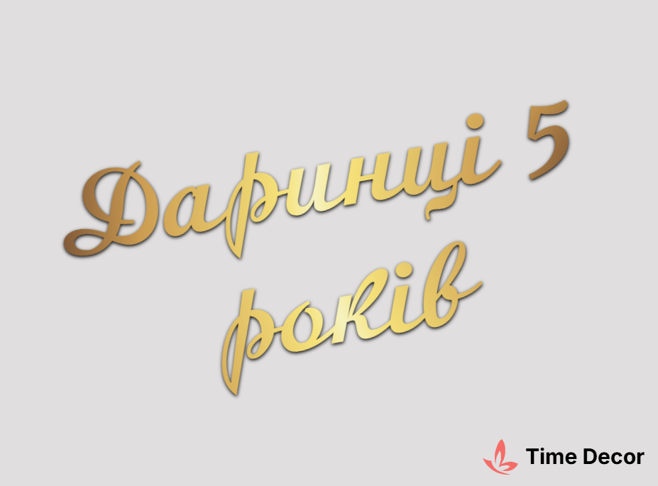 Пластиковий напис "Даринці 5 років" – дзеркальний або матовий пластик, можливе виготовлення з клейкою зворотною поверхнею для легкого монтажу.