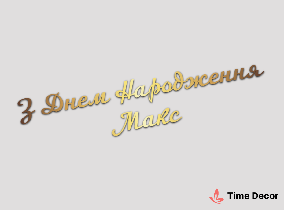 Пластиковий напис "З Днем Народження Макс" – дзеркальний або матовий пластик, можливе виготовлення з клейкою зворотною поверхнею для легкого монтажу.