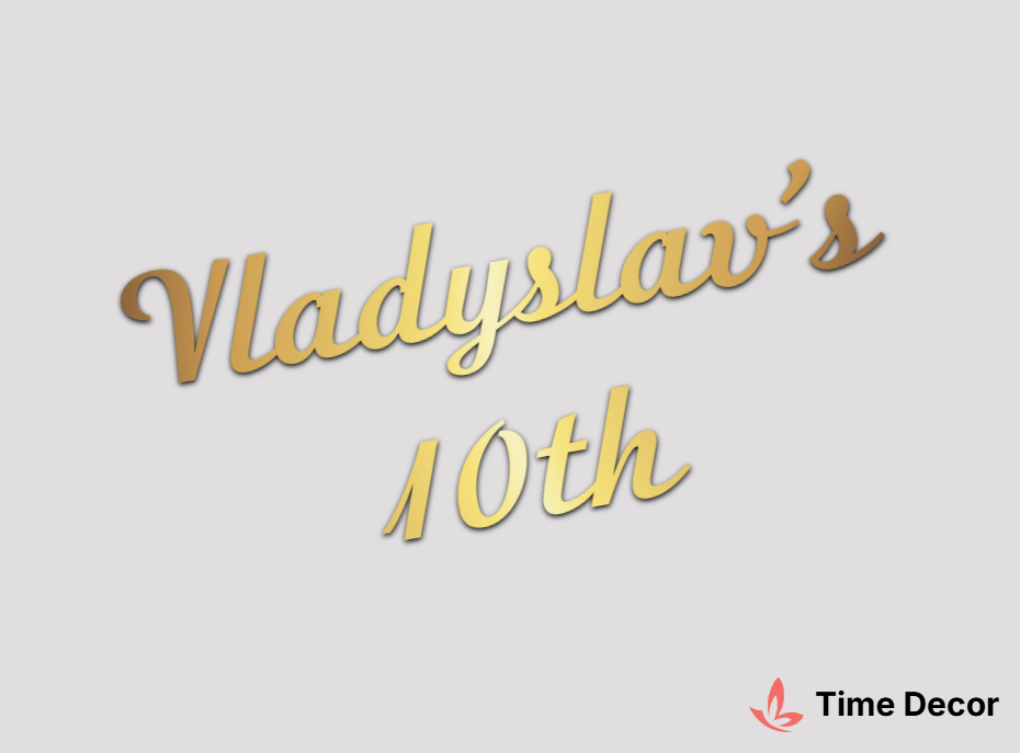 Пластиковий напис "Vladyslav’s 10th" – дзеркальний або матовий пластик, можливе виготовлення з клейкою зворотною поверхнею для легкого монтажу.