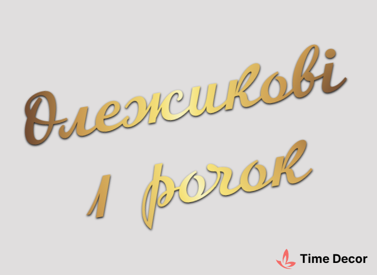 Пластиковий напис "Олежикові 1 рочок" – дзеркальний або матовий пластик, можливе виготовлення з клейкою зворотною поверхнею для легкого монтажу.