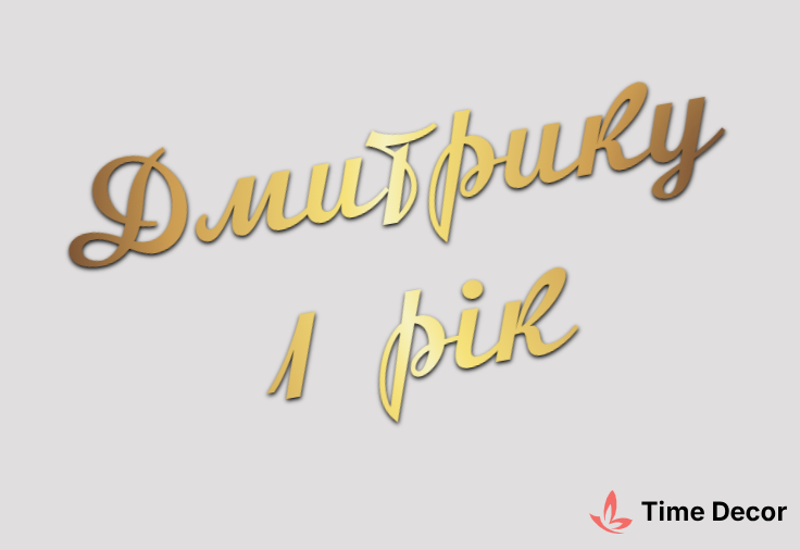 Пластиковий напис "Дмитрику 1 рік" – дзеркальний або матовий пластик, можливе виготовлення з клейкою зворотною поверхнею для легкого монтажу.
