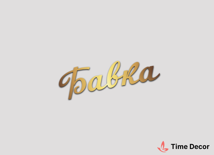 Пластиковий напис "Бавка" – дзеркальний або матовий пластик, можливе виготовлення з клейкою зворотною поверхнею для легкого монтажу.