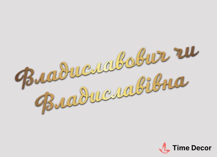 Пластиковий напис "Владиславович чи Владиславівна" – дзеркальний або матовий пластик, можливе виготовлення з клейкою зворотною поверхнею для легкого монтажу.