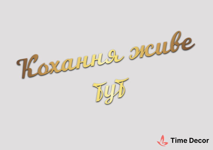 Пластиковий напис "Кохання живе тут" – дзеркальний або матовий пластик, можливе виготовлення з клейкою зворотною поверхнею для легкого монтажу.