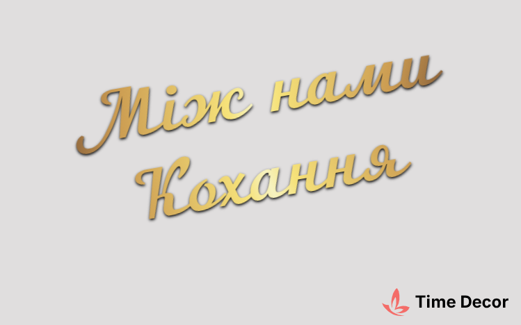 Пластиковий напис "Між нами Кохання" – дзеркальний або матовий пластик, можливе виготовлення з клейкою зворотною поверхнею для легкого монтажу.