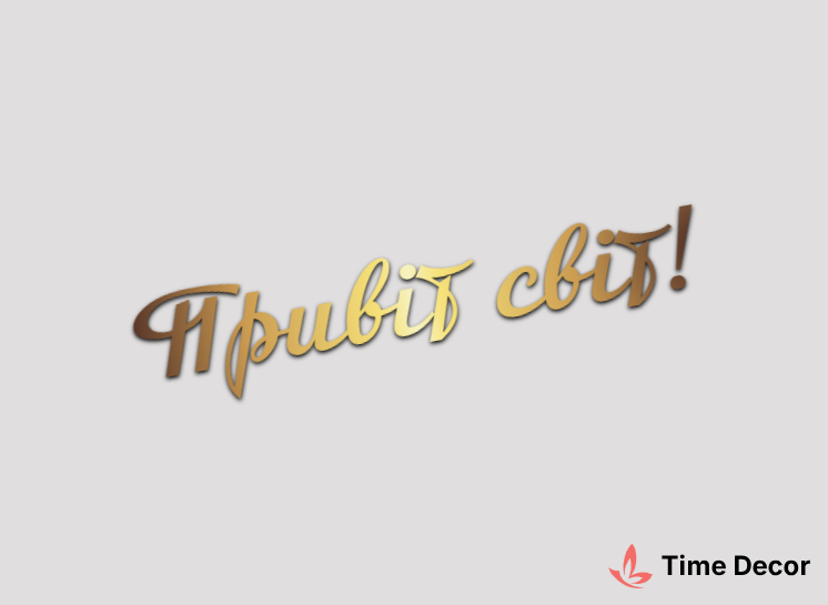 Пластиковий напис "Привіт світ!" – дзеркальний або матовий пластик, можливе виготовлення з клейкою зворотною поверхнею для легкого монтажу.