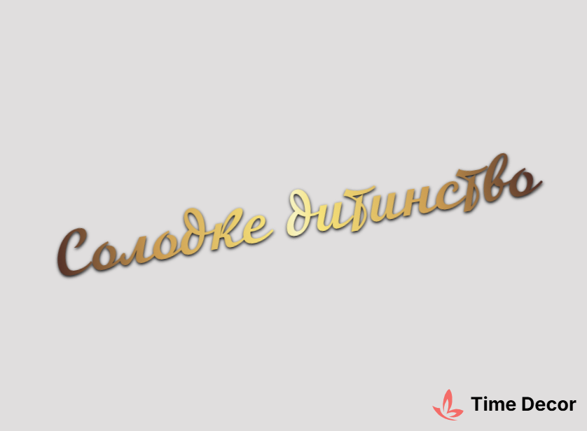 Пластиковий напис "Солодке дитинство" – дзеркальний або матовий пластик, можливе виготовлення з клейкою зворотною поверхнею для легкого монтажу.