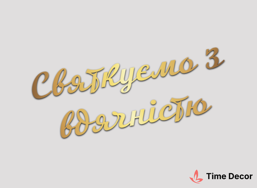 Пластиковий напис "Святкуємо з вдячністю" – дзеркальний або матовий пластик, можливе виготовлення з клейкою зворотною поверхнею для легкого монтажу.