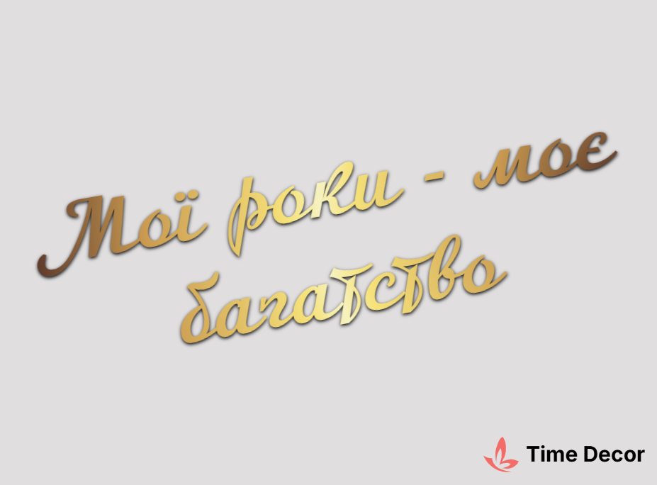 Пластиковий напис "Мої роки - моє багатство" – дзеркальний або матовий пластик, можливе виготовлення з клейкою зворотною поверхнею для легкого монтажу.