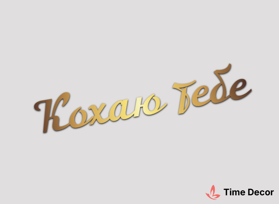 Пластиковий напис "Кохаю тебе" – дзеркальний або матовий пластик, можливе виготовлення з клейкою зворотною поверхнею для легкого монтажу.