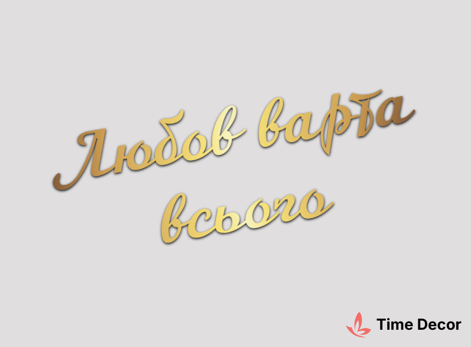 Пластиковий напис "Любов варта всього" – дзеркальний або матовий пластик, можливе виготовлення з клейкою зворотною поверхнею для легкого монтажу.