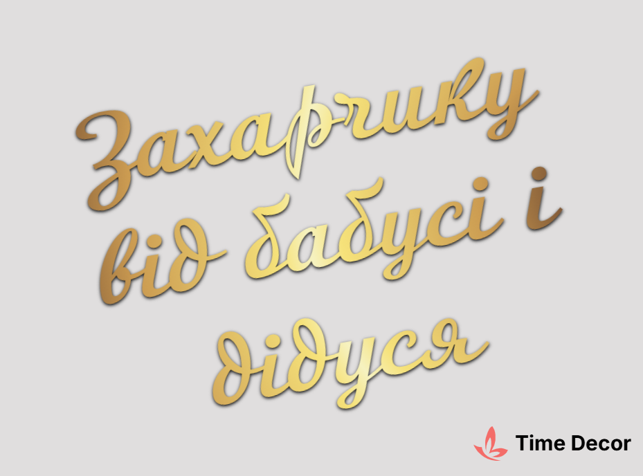 Пластиковий напис "Захарчику від бабусі і дідуся" – дзеркальний або матовий пластик, можливе виготовлення з клейкою зворотною поверхнею для легкого монтажу.
