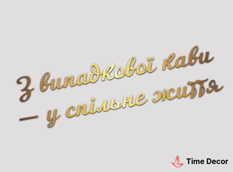 Пластиковий напис "З випадкової кави — у спільне життя" – дзеркальний або матовий пластик, можливе виготовлення з клейкою зворотною поверхнею для легкого монтажу.