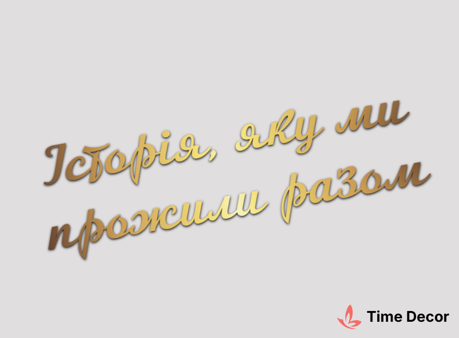 Пластиковий напис "Історія, яку ми прожили разом" – дзеркальний або матовий пластик, можливе виготовлення з клейкою зворотною поверхнею для легкого монтажу.