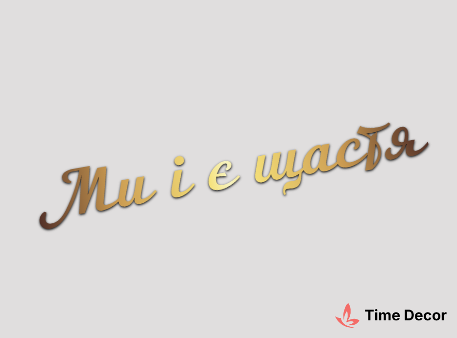 Пластиковий напис "Ми і є щастя" – дзеркальний або матовий пластик, можливе виготовлення з клейкою зворотною поверхнею для легкого монтажу.