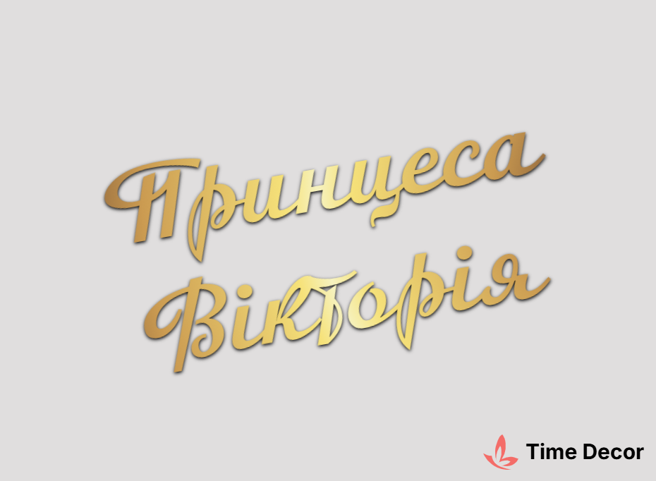 Пластиковий напис "Принцеса Вікторія" – дзеркальний або матовий пластик, можливе виготовлення з клейкою зворотною поверхнею для легкого монтажу.