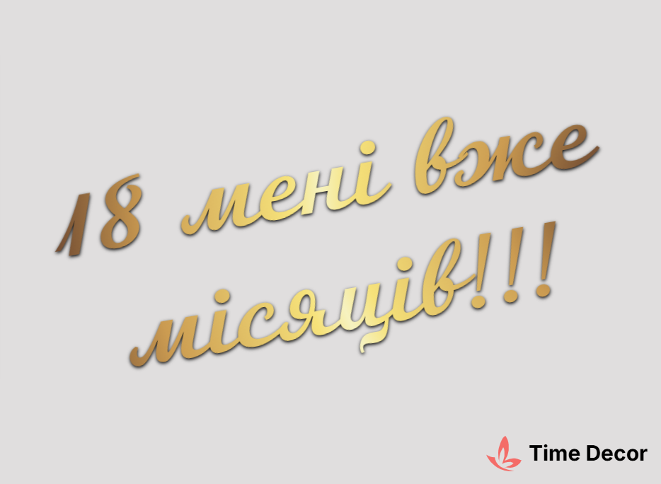 Пластиковий напис "18 мені вже місяців!!!" – дзеркальний або матовий пластик, можливе виготовлення з клейкою зворотною поверхнею для легкого монтажу.