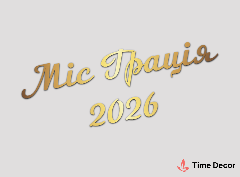Пластиковий напис "Міс Грація 2026" – дзеркальний або матовий пластик, можливе виготовлення з клейкою зворотною поверхнею для легкого монтажу.