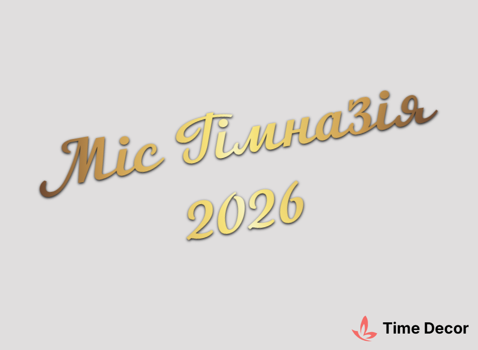 Пластиковий напис "Міс Гімназія 2026" – дзеркальний або матовий пластик, можливе виготовлення з клейкою зворотною поверхнею для легкого монтажу.