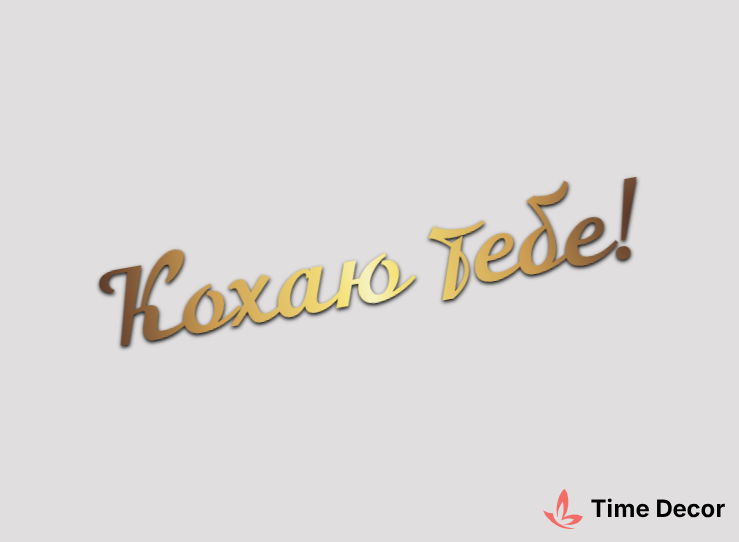Пластиковий напис "Кохаю тебе!" – дзеркальний або матовий пластик, можливе виготовлення з клейкою зворотною поверхнею для легкого монтажу.