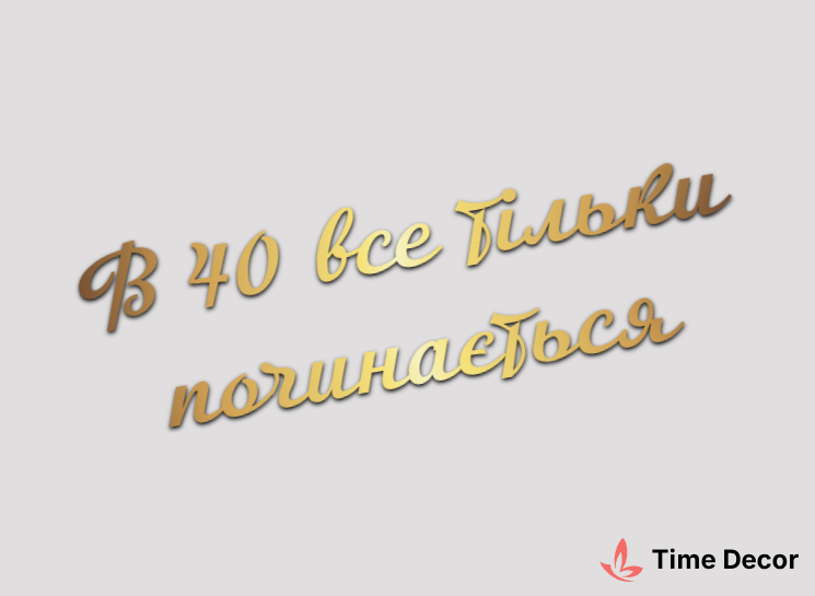 Пластиковий напис "В 40 все тiльки починається" – дзеркальний або матовий пластик, можливе виготовлення з клейкою зворотною поверхнею для легкого монтажу.
