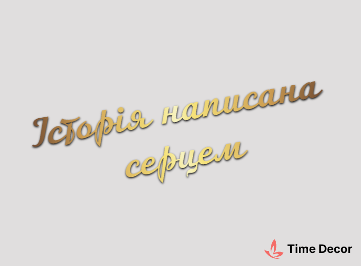 Пластиковий напис "Історія написана серцем" – дзеркальний або матовий пластик, можливе виготовлення з клейкою зворотною поверхнею для легкого монтажу.