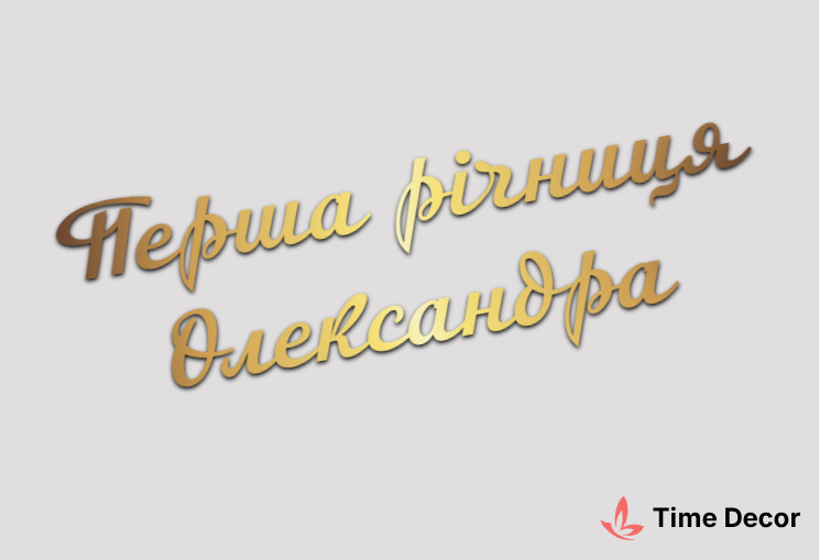 Пластиковий напис "Перша річниця Олександра" – дзеркальний або матовий пластик, можливе виготовлення з клейкою зворотною поверхнею для легкого монтажу.