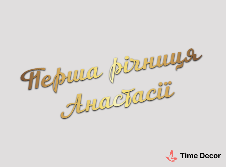 Пластиковий напис "Перша річниця Анастасії" – дзеркальний або матовий пластик, можливе виготовлення з клейкою зворотною поверхнею для легкого монтажу.
