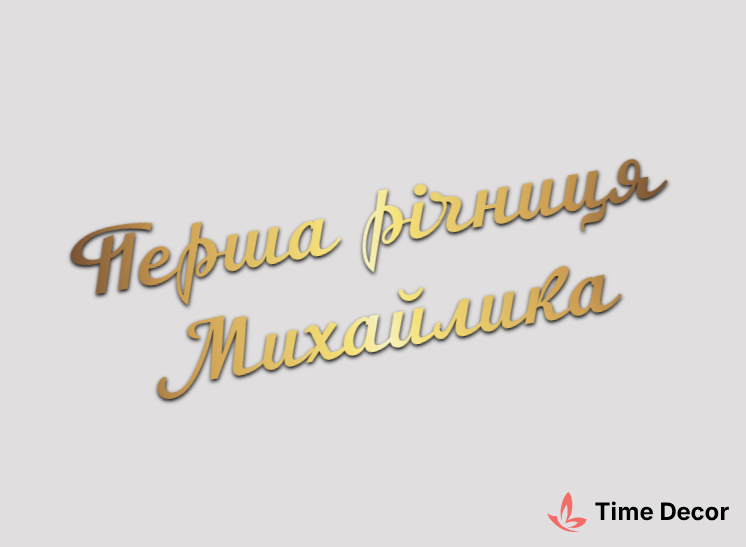 Пластиковий напис "Перша річниця Михайлика" – дзеркальний або матовий пластик, можливе виготовлення з клейкою зворотною поверхнею для легкого монтажу.