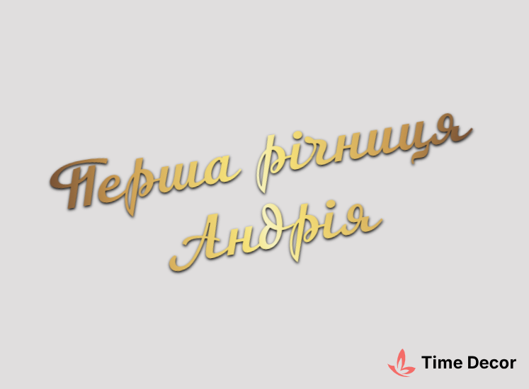 Пластиковий напис "Перша річниця Андрія" – дзеркальний або матовий пластик, можливе виготовлення з клейкою зворотною поверхнею для легкого монтажу.
