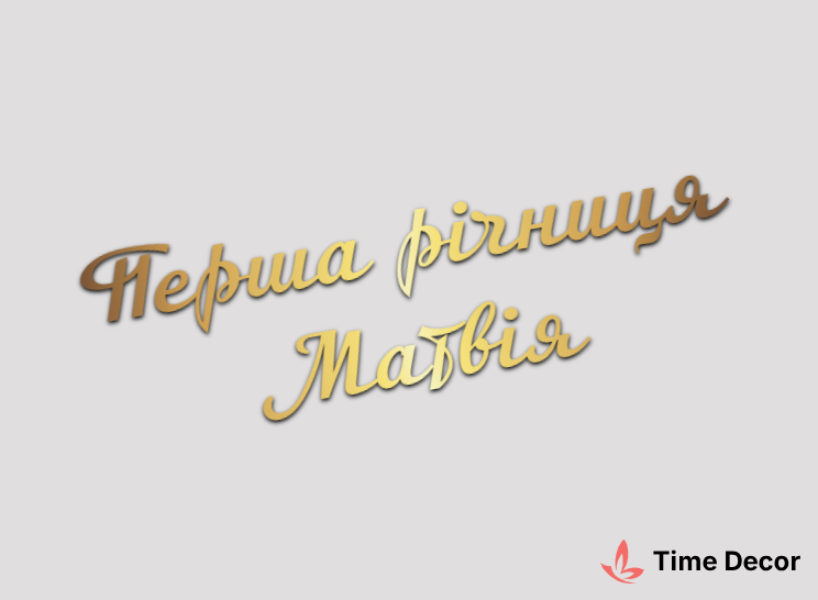 Пластиковий напис "Перша річниця Матвія" – дзеркальний або матовий пластик, можливе виготовлення з клейкою зворотною поверхнею для легкого монтажу.