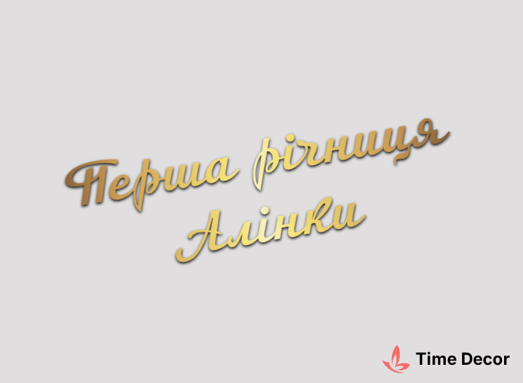 Пластиковий напис "Перша річниця Алінки" – дзеркальний або матовий пластик, можливе виготовлення з клейкою зворотною поверхнею для легкого монтажу.