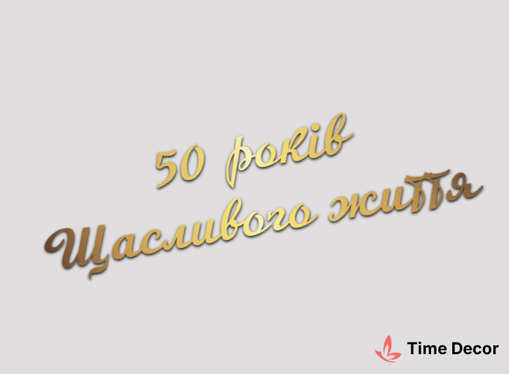 Пластиковий напис "50 років Щасливого життя" – дзеркальний або матовий пластик, можливе виготовлення з клейкою зворотною поверхнею для легкого монтажу.