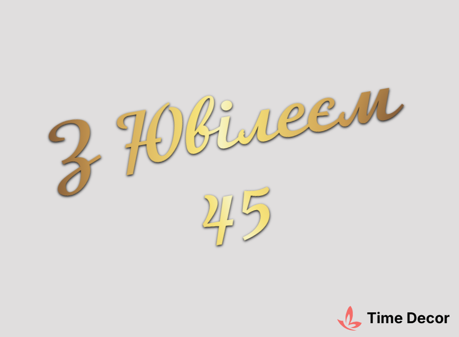 Пластиковий напис "З Ювілеєм 45" – дзеркальний або матовий пластик, можливе виготовлення з клейкою зворотною поверхнею для легкого монтажу.