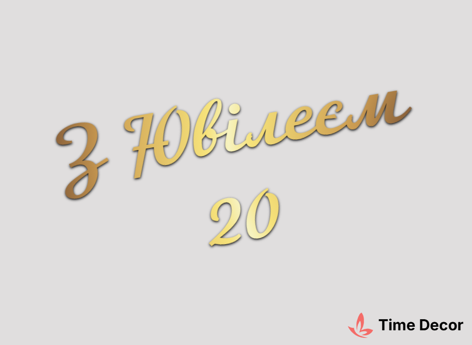 Пластиковий напис "З Ювілеєм 20" – дзеркальний або матовий пластик, можливе виготовлення з клейкою зворотною поверхнею для легкого монтажу.