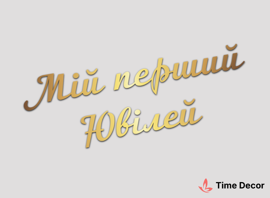 Пластиковий напис "Мій перший Ювілей" – дзеркальний або матовий пластик, можливе виготовлення з клейкою зворотною поверхнею для легкого монтажу.