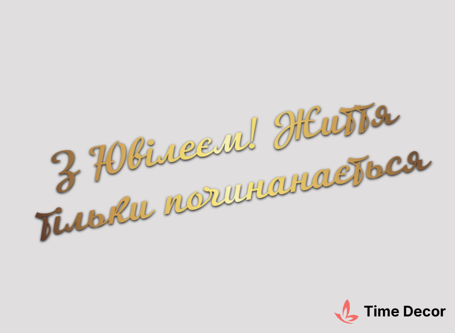 Пластиковий напис "З Ювілеєм! Життя тільки починанається" – дзеркальний або матовий пластик, можливе виготовлення з клейкою зворотною поверхнею для легкого монтажу.
