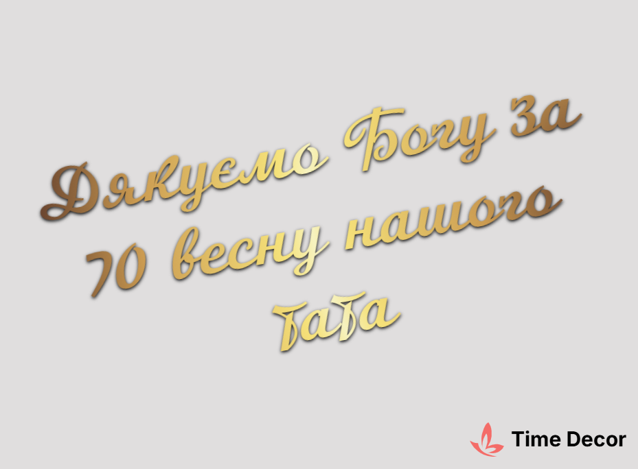 Пластиковий напис "Дякуємо Богу за 70 весну нашого тата" – дзеркальний або матовий пластик, можливе виготовлення з клейкою зворотною поверхнею для легкого монтажу.