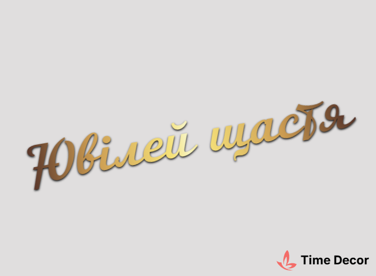 Пластиковий напис "Ювілей щастя" – дзеркальний або матовий пластик, можливе виготовлення з клейкою зворотною поверхнею для легкого монтажу.