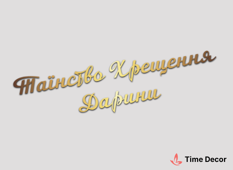 Пластиковий напис "Таїнство Хрещення Дарини" – дзеркальний або матовий пластик, можливе виготовлення з клейкою зворотною поверхнею для легкого монтажу.