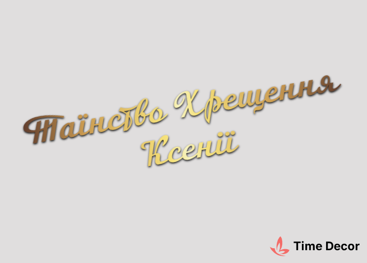 Пластиковий напис "Таїнство Хрещення Ксенії" – дзеркальний або матовий пластик, можливе виготовлення з клейкою зворотною поверхнею для легкого монтажу.