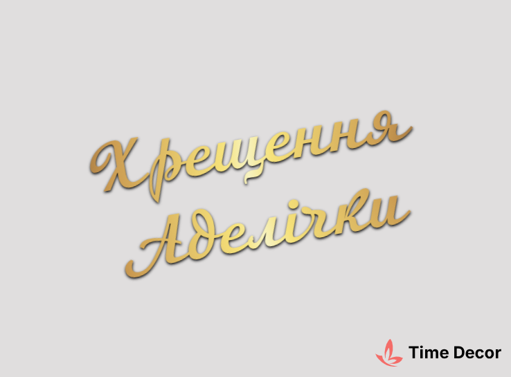 Пластиковий напис "Хрещення Аделічки" – дзеркальний або матовий пластик, можливе виготовлення з клейкою зворотною поверхнею для легкого монтажу.