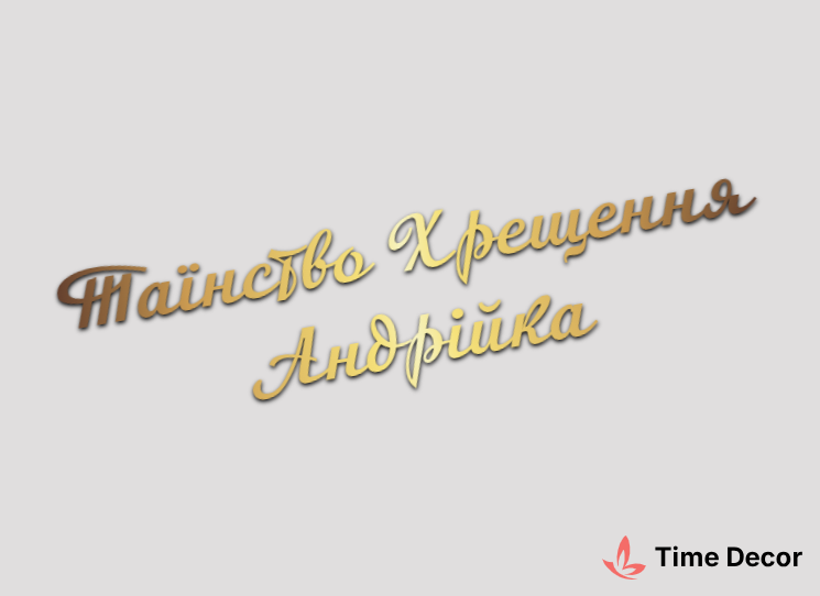 Пластиковий напис "Таїнство Хрещення Андрійка" – дзеркальний або матовий пластик, можливе виготовлення з клейкою зворотною поверхнею для легкого монтажу.