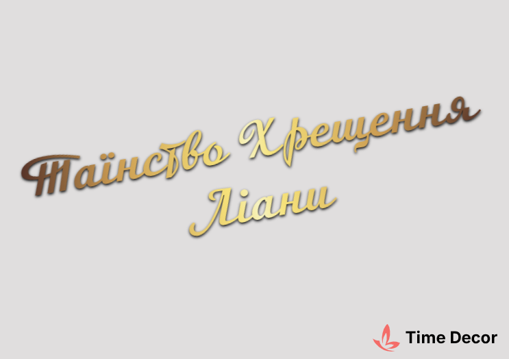 Пластиковий напис "Таїнство Хрещення Ліани" – дзеркальний або матовий пластик, можливе виготовлення з клейкою зворотною поверхнею для легкого монтажу.