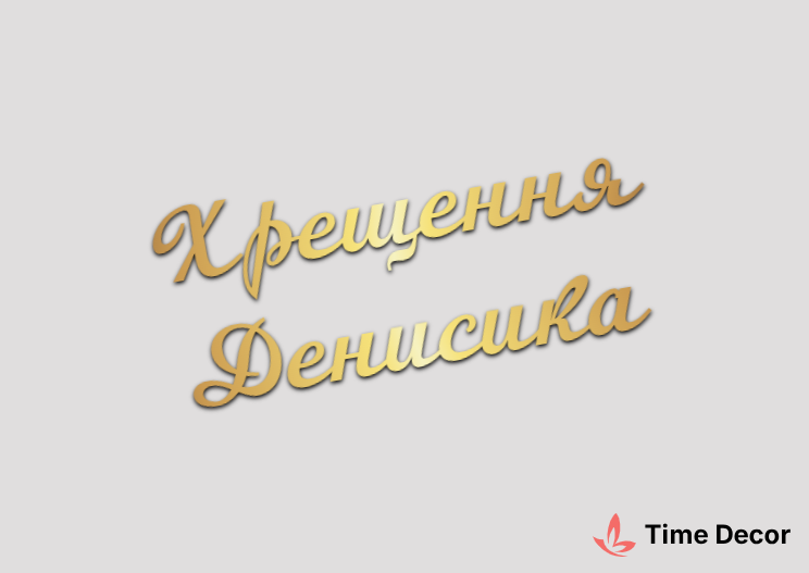 Пластиковий напис "Хрещення Денисика" – дзеркальний або матовий пластик, можливе виготовлення з клейкою зворотною поверхнею для легкого монтажу.