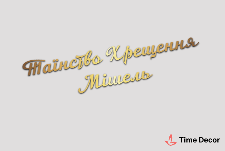 Пластиковий напис "Таїнство Хрещення Мішель" – дзеркальний або матовий пластик, можливе виготовлення з клейкою зворотною поверхнею для легкого монтажу.